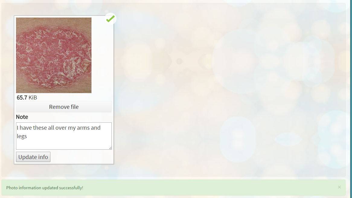 After successfully uploading a photo or video there will be a green check mark noting success. A red X means there was some sort of error uploading your photo or video. If you decide you don't want to keep this photo or video for your case you can click the Remove file button to delete it. Optionally you can add a note about your photo or video. If you add a note, press the Update info button. Once the info has been updated, you will see a green alert stating that your photo information was updated successfully.