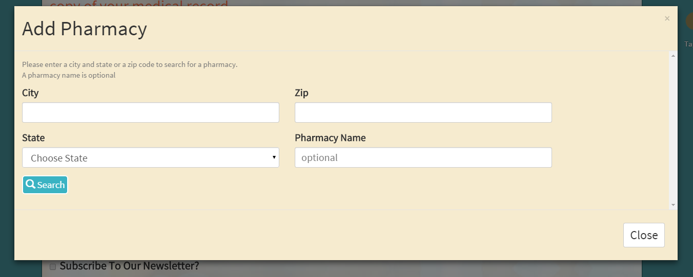 To select your preferred pharmacy, click the Add Pharmacy button. This will pop up a window for you to search for your pharmacy. Enter your city and state, or zip code and optionally the pharmacy name and press search.