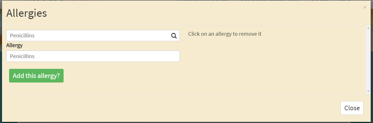 To enter your allergies, search for an allergen by entering at least 3 letters. Similar to the medications, once you've entered 3 letters, a list of allergens will appear for you to choose from. Click on the allergen name. If you need to remove an allergen, either because it is an error, or you no longer have that allergy, click on the allergen to remove it.