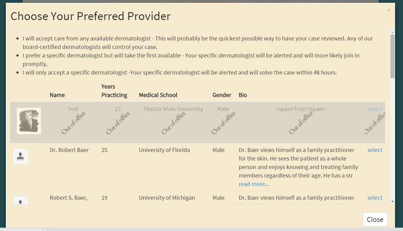 If you click on the ? a window will pop up with more information about the various providers to help you decide on a provider. If a provider is not accepting patients at the time you are creating your case, they will be listed as out of office.