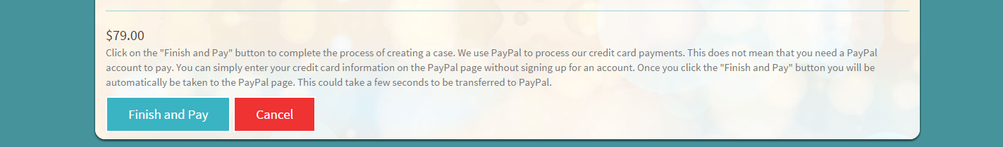 We utilize PayPal to process credit card payments. If you have a PayPal account you can log in to your account to pay for your case.